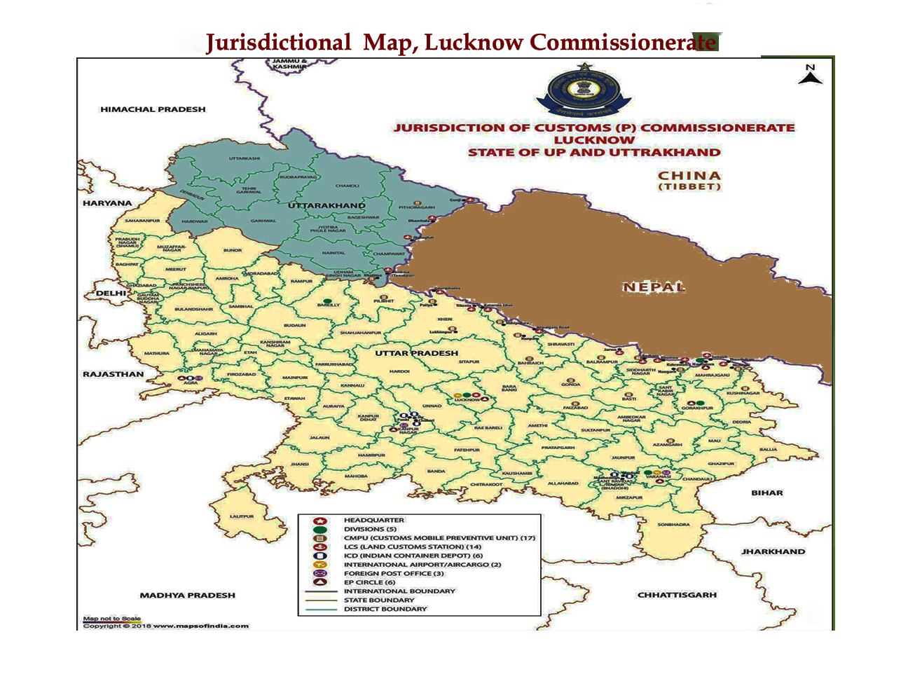 Customs (Prev.) Commissionerate, Lucknow, came into existence with effect from 02.06.1994, following bifurcation of the erstwhile Customs (Prev.) Commissionerate, Indo-Nepal Border, with HQ at Patna. The Jurisdiction of Lucknow Commissionerate extends over the states of Uttar Pradesh and Uttarakhand covering international borders of 776 Km with Nepal and 350 Km with China through intractable hill areas and dense forests. The twin objectives of the Commissionerate are Prevention of smuggling emanating from across the porous Indo-Nepal border, and to facilitate trade with Nepal and China through its 14 LCSs and trade with other countries through 06 ICDs.
