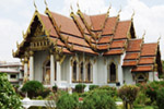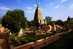The temple stands in the east to the Bodhi Tree. Its architectural effect is superb. Its basement is 48 square feet and it rises in the form of a slender Pyramid till it reaches its neck, which is cylindrical in shape. The total height of the temple is 170 ft. and on the top of the temple are Chatras which symbolize sovereignty of religion. Four towers on its corners rise gracefully giving the holy structure a poise balance. This sacred edifice is like a grand banner unfurled by time to proclaim to the world the pious efforts of the Buddha to solve the knots of human miseries, to ascend above worldly problems and to attain transcendental peace through wisdom, good conduct and disciplined life. Inside the temple, in the main sanctum, there is a colossal image of the Buddha in sitting posture touching the earth by his right hand. In this posture the Buddha accomplished the supreme enlightenment. The statue is of black stone but it has been guilder by the devotees. The entire courtyard of the temple is studded with large number of votive stupas. These stupas are of all sizes built during the past 2500 years ago. Most of them are extremely elegant in structural beauty. The ancient railings, which surround the temple, are of the first century BC and are among the very interesting monuments of the century. |